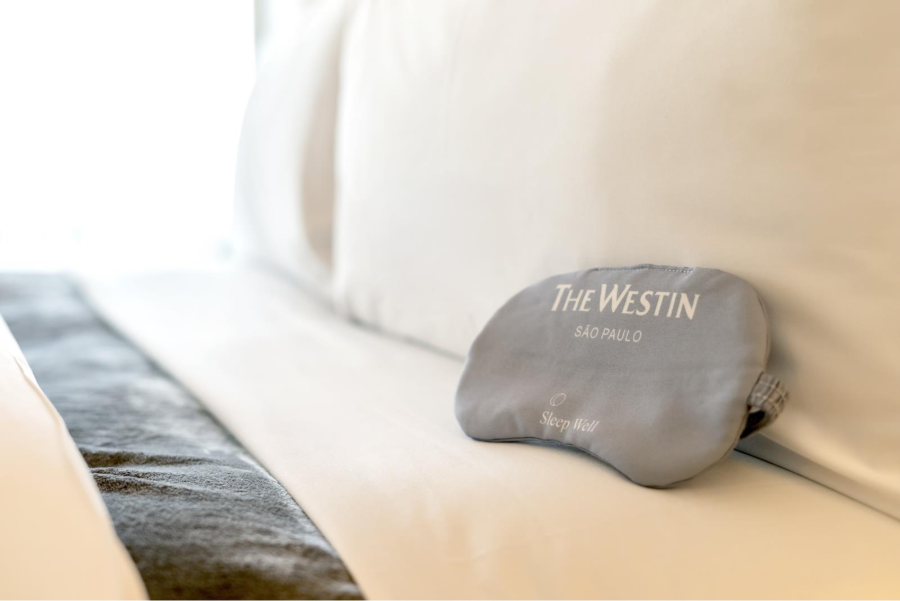 Venda para os olhos personalizada do Hotel The Westin São Paulo em cima de uma cama, elemento que reforça um dos pilares de marca: “Sleep Well”. (Foto: Tadeu Brunelli/The Westin São Paulo/Reprodução)