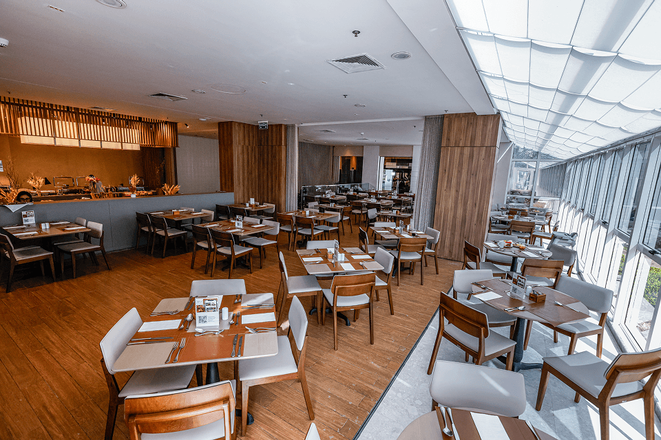 (Fonte: Restaurante Ventanas/Hotel Deville Prime Porto Alegre) Após reforma, o Restaurante Ventanas do Hotel Deville Prime Porto Alegre apresenta tons claros, texturas suaves e elementos naturais. A imagem mostra o espaço, que no momento do registro recebe luz natural.